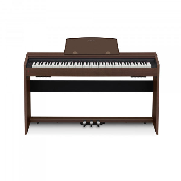 PX-770 erbjuder många smarta nya funktioner som underlättar för undervisning och övning. Ett helt nytt grand piano som återger en realistisk klang och fantastisk spelkänsla. Ljuden PX-770 har en prisbelönad AiR-ljudkälla inklusive ett stereo grand piano med realistisk resonans som simulerar klangen av hela instrumentet och inte bara strängarna. Förutom det nya pianot så erbjuder också PX-770 19 olika ljud och självklart finns det möjlighet att splitta och lagra ljud. Känslan Den hyllade Tri-Sensor II Scaled Hammer Action tekniken ger den perfekta känslan. Den simulerade ebenholts- och elfenbenstexturen på tangenterna i kombination med Casios innovativa hammarteknik ger dig en autentisk spelkänsla. Justera själv anslagskänslighet och delay från det att tangenten trycks ned till att tonen produceras. Högtalarna PX-770 har ett kraftfullt förstärkarsystem i stereo. Högtalarna är placerade för att skapa en optimal lyssnarupplevelse och ljudet är kristallklart över hela ljudspektrat. Verktyget för elev och lärare PX-770's praktiska funktioner är användbara både i studion, replokalen, kyrkan, aulan,, konserthallen och för hemmabruk. Anslut två hörlurar samtidigt med 1/4" plugg på frontpanelen. Praktiskt för tyst övning och tysta lektioner. Duet mode splittar pianot i två lika pitch ranges vilket gör att både elev och lärare kan spela på samma instrument. Praktiska funktioner PX-770's praktiska funktioner är användbara både i studion, replokalen, kyrkan, aulan,, konserthallen och för hemmabruk. Anslut två hörlurar samtidigt med 1/4" plugg på frontpanelen. Praktiskt för tyst övning och tysta lektioner. Duet mode splittar pianot i två lika pitch ranges vilket gör att både elev och lärare kan spela på samma instrument. Concert Play Concert Play låter dig spela till tio välkända orkesterstycken. Lyssna till pianodelen eller tysta ned pianoinspelningen så att du själv kan spela till orkesterstycket. Det blir lätt att öva eftersom PX-770 också kan sänka tempot på övnings- och orkesterstycken utan att det påverkar tonarten. Casio Music Space - Ladda ner appen gratis på App Store eller Google Play Enkelt att koppla till din enhet Koppla PX-770 till din dator, iOS, Android utan att behöva installera drivrutiner eller andra programvaror genom class-compilant USB.